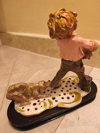 Scultura in porcellana raffigura un ragazzo che tiene in braccio due cuccioli mentre la mamma lo tira per il lembo del pantalone.