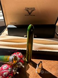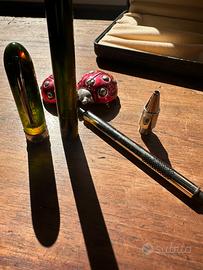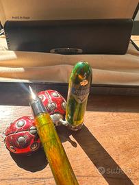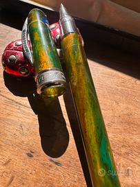 Visconti, edizione limitata van Gogh - Cafè Terrace at Night, in resina trasparente (si vedano le foto) in tonalità verde, arancio, marrone, lavorata a marmo, con i cambi di colore ed ombre che hanno reso celebre il maestro fiammingo. La particolarità delle Visconti van Gogh risiede nella loro unicità: nessuna penna è uguale all’altra ed i colori mettono in risalto la forza espressiva di questo strumento di scrittura unico. Questa splendida e rara penna stilografica è prodotta a Firenze da Visconti, ha il celebre fermaglio ad arco rodiato con incisione del logo su entrambe i lati. Ogni penna rappresenta uno dei quadri più famosi dell’artista olandese ed attraverso il colore emerge la carica espressiva delle opere di Van Gogh. La forma a 18 lati, mai realizzata prima, conferisce alla penna eleganza ed una luminosità che mette in risalto le sfumature intense e profonde. Roller originale Visconti da sostiruire. È corredato della sua lussuosa scatola Visconti in similpelle blu, con stampa pelle di coccodrillo in velluto beige (in foto). È corredata anche dal portapenne da viaggio Visconti, a due posti (in foto). La penna è come nuova (ha ancora lo steacker originale Visconti), misura chiusa 12 cm.. Stante il valore la penna viene spedita solo a clienti con adeguate valutazioni. È parte di una grande collezione di un gentiluomo che abbiamo l'onore di trasferire a persone ricercate. Altrimenti nella bacheca c'è molto altro (basta cliccare su EXCLUSIVA). Buona scelta