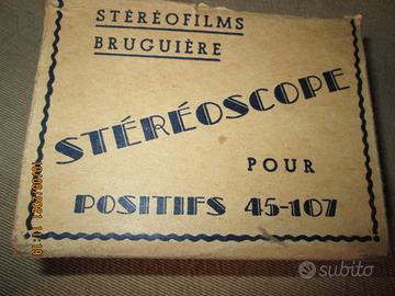 Il visore risale agli anni '50. " Stereofilms Bruguiere- Stereoscope pour positifs45-107" Questa è la scritta sulla scatola. Sono allegate 4 scatolette contenenti in totale 48 positifs in bianco e nero: Lourdes 1 - Lourdes 2 - Lourdes illuminata - La via crucis.