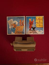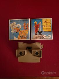 Vendo visore 3D VIEW MASTER e 2 set completi di dischi (21 immagini ciascuno) 'La spada nella roccia ' e 'Le avventure di Paperino' degli anni '70 funzionante ed in ottimo stato considerando l'eta' e con qualche lieve segno di usura sul visore.