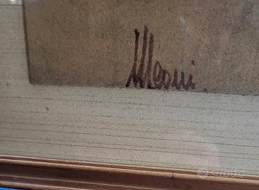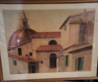 Vittorio Meoni (1859–1937), un pittore, politico e giornalista italiano originario di Colle di Val d'Elsa, è stato un artista poliedrico la cui carriera pittorica ha attraversato diverse fasi stilistiche fondamentali per l'arte toscana e italiana a cavallo tra '800 e '900. Inizialmente influenzato dai Macchiaioli, Meoni si è successivamente evoluto verso il Divisionismo, dedicandosi a ricerche cromatiche e luministiche più rigorose. È conosciuto principalmente come paesaggista. Le sue opere ritraggono con sensibilità le campagne toscane (Val d'Elsa, Lucchesia, Mugello), ma anche paesaggi della Sicilia e della costiera campana (Capri e Amalfi). Ha esposto nelle più prestigiose sedi dell'epoca, incluse le Biennali di Venezia (1912, 1922, 1924) e le Secessioni Romane. Alcune sue opere sono conservate presso la Galleria d'Arte Moderna di Palazzo Pitti a Firenze e a Roma. Il dipinto mostra uno scorcio urbano caratterizzato da tetti, case dai toni chiari con persiane verdi e, in posizione dominante a sinistra, una grande cupola con lanterna. La tecnica è un disegno a matita, carboncino o sanguigna, possibilmente con lievi velature di colore o acquerello. Meoni, celebre paesaggista toscano, in questa opera, raffigura una cupola che richiama fortemente l'architettura rinascimentale tipica di città come Firenze (ad esempio la Cupola del Brunelleschi vista da una prospettiva laterale) o altre città toscane, temi centrali nella sua produzione. Firma: in basso a sinistra. Cornice con vetro Dimensioni: 40x55
