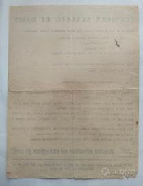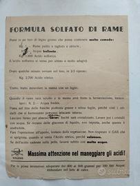 Questo volantino è un interessante documento di storia agricola italiana. Periodo stimato: Dalle caratteristiche tipografiche, dai font utilizzati (come il carattere distintivo del titolo) e dalle unità di misura espresse, il volantino sembra risalire alla prima metà del XX secolo, indicativamente tra gli anni '20 e gli anni '40. Indizi: II linguaggio ("tino di legno", "frasche grosse") e l'uso di acidi puri (solforico e nitrico) per produrre il solfato di rame "in casa" riflette pratiche agricole comuni prima della diffusione di massa dei prodotti industriali pre-miscelati. Curiosità: La formula descrive la preparazione della poltiglia bordolese o simili composti rameici usati come fungicidi, avvertendo della pericolosità dei gas velenosi sprigionati dalla reazione chimica. Valore collezionistico: Il valore economico è principalmente simbolico e decorativo, tipico del collezionismo di "cartaceo minore" o ephemera agricola Interesse: È ricercato da collezionisti di storia locale, musei della civiltà contadina o come pezzo d'arredo per agriturismi e cantine storiche. Nota di sicurezza: La formula riportata è storica e prevede l'uso di sostanze estremamente rare e tossiche. Non deve essere assolutamente replicata. N.B.: spese di spedizione a carico dell' acquirente!