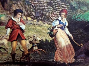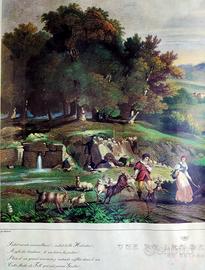 Paesaggio pastorale con una coppia che cammina lungo un sentiero accompagnata da capre. A sinistra si notano alberi, rocce e una cascata; a destra un lago o fiume con montagne sullo sfondo.