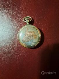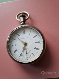 WALTHAM orologio da tasca, modello ferrovia, P. S. Bartlett? Cassa in silveroid con decorazione di locomotiva in oro rosa. Quadrante bianco con numeri romani, contasecondi a ore sei, lancette dorate. Fine Ottocento (ca. 1898), periodo vittoriano. Non testato funzionamento, andrebbe revisionato. Lievissimi segni del tempo (vedi vetro in foto n. 3), ma in condizioni ottime vista l’epoca. Diametro cm. 5,3 senza corona.