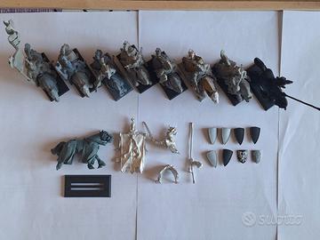 N° 9 cavalieri Bretonnia. 7 miniature in plastica, 2 in metallo (portastendardo d'armata e miniatura con prime nero). Cavalli tutti in plastica tranne testa in metallo del cavallo con prime nero