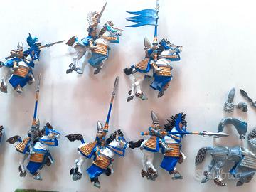 5 elmi d'argento alti elfi con gruppo comando + 4 arcieri, miniature in plastica in ottime condizioni. Da notare che mancano gli scudi (eccetto uno). Inoltre manca lo zoccolo della zampa destra davanti del primo cavaliere (foto 2).