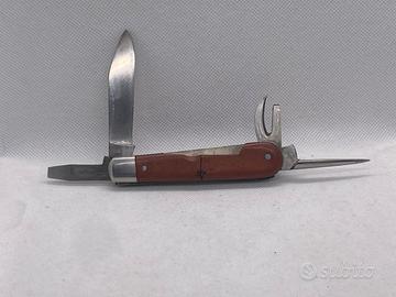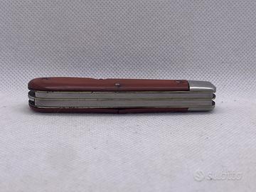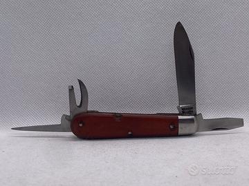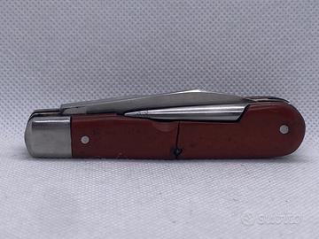 Questo Wenger Tahara è un pregiato coltello svizzero d'epoca, prodotto tra gli anni '20 e '40 come linea di lusso della Wenger. Presenta la classica configurazione multiuso con lama principale, apriscatole a falce, punteruolo e cacciavite. Le guance in fibra rossa e il punzone sulla lama ne testimoniano l'autenticità storica, rendendolo un pezzo da collezione nonostante i segni del tempo e la crepa sul manico. Le molle funzionano.