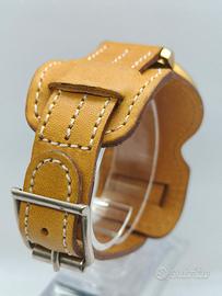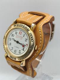 In vendita questo particolare orologio militare Western 1868, una commemorazione/omaggio agli orologi militari degli anni '40, prodotti negli anni '80, orologi New Old Stock, con movimento meccanico a carica manuale con cassa intagliata e decorata in bagno d'oro e felpe militari dell'epoca. - Meccanica originale Western a carica manuale (a corda) (Swiss Made), misura della cassa 42,5 mm x 38 mm incluse corona e anse e 36,5 mm senza corona (grandi dimensioni all'epoca), splendido quadrante militare originale Western Unpolluted di colore bianco, lancette tipo Dauphine nere con secondi centrali in rosso e numeri arabi originali del modello nero, cassa intagliata e decorata in bagno d'oro originale con fondello in acciaio inossidabile.