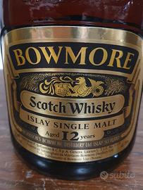 Bottiglia Whisky Bowmore 12 years - 43% 75 cl con Box, importata da P. Soffiantino Genova, con etichette capsula e livello in buone condizioni, cosi come la scatola, vedi foto.