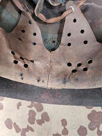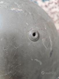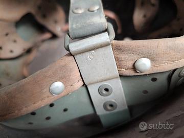 Elmetto ITALIANO M33 ww2 COMPLETO con marchio A.T. (Arsenale di Torino) Interno grigio/verde con ganci rettangolari e sottogola in cuoio. Prese di 2° tipo o d'aria a "scalino". Cuffia interna di cuoio con cuciture parallele. In Buone/Ottime condizioni. Riverniciato in periodo post-bellico.