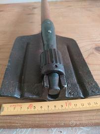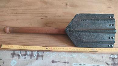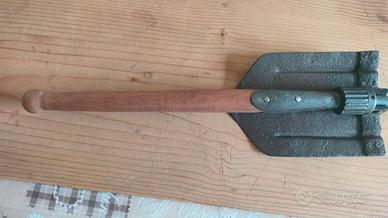 Pala snodata che equipaggiava l'esercito tedesco (wehrmacht) in alternativa alla ben più diffusa, robusta ed affidabile versione a lama fissa. Infatti nell'utilizzo sul campo, la versione ripiegabile avevo dimostrato tutti i limiti di robustezza dello snodo in bachelite (così come d'altra parte succedeva alla corrispondente versione US, anch'essa snodata, ma con ghiera di serraggio in metallo). Per questo motivo risulta anche meno diffusa della versione a lama fissa. La vanghetta in vendita è stata recuperata in cattive condizioni, con snodo bloccato dalla ruggine ed il manico in legno, compromesso. Nel restauro si è quindi proceduto allo sblocco delle parti, ripulitura generale del ferro dalla ruggine, ripristino dello snodo e del bullone in bachelite, sostituzione del manico, non più recuperabile, con uno rifatto di pari dimensioni. La vanghetta è stata quindi recuperata, nel rispetto per quanto possibile, del valore storico residuo. Il fatto che sia funzionante nelle sue parti mobili, non ne garantisce comunque la funzionalità e la resistenza necessaria, per essere impiegata nei lavori comuni di sterro... Pertanto viene proposta così come è, vista e piaciuta, quale oggetto militare da collezione o come complemento di equipaggiamento del soldato tedesco, nelle rievocazioni storiche WW2. La vanghetta si trova a Carpi (Mo). Disponibile per ritiro a mano in loco. Possibile anche l'eventuale spedizione, con spese a parte (e corriere da concordare, in relazione al formato necessario per inserirla nel pacco)