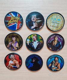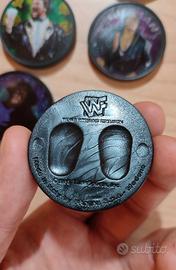 Vendo lotto raro vintage composto da 39 Pogs originali WWF Matchcaps / Slammer anni ’90 in ottime condizioni con retro Titan Sports.