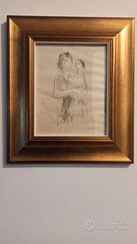 Xavier bueno china su carta 20x25 OPERA UNICA documentata e autenticata su fotografia dalla Fiesole foundation. L’importanza e il valore di questo disegno unico nel suo genere sta’ nel fatto che il maestro vuole intensificare l’importanza dello sguardo dei soggetti che rivolgono gli occhi direttamente a chi li guarda e il valore della maternità che indica la condizione di essere madre, il legame affettivo madre-figlio, e il periodo di gestazione Xavier Bueno (1915-1979): È l'artista che ha dedicato la maggiore attenzione a questo tema. Le sue "Maternità" sono caratterizzate da un forte realismo sociale e da una profonda malinconia. •Soggetto: Madri con bambini, spesso colti in momenti di quotidiana tenerezza o solitudine. In questo caso abbiamo il melodioso coinvolgimento della dolcezza e del riserbo. •Stile di Xavier: Pennellate dense, pastelli patinati e una forte introspezione psicologica che lo ha reso uno dei principali esponenti dei “pittori della realtà” •Valore artistico: Le maternità di Xavier Bueno sono oggi molto ricercate sul mercato dell'arte e presenti in importanti collezioni pubbliche. Spesso il maestro ritrae madri con sguardi intensi e volti segnati, immerse in atmosfere sospese e materiche, che riflettono la sofferenza umana e la dignità del legame familiare.