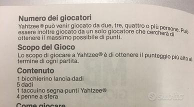 Il gioco contiene 1 bicchierino lancia-dadi, 5 dadi, 1 taccuino segna-punti ancora da scrivere, 3 penne a sfera (manca la quarta), 1 vassoietto verde dove lanciare i dati, 1 regolamento in italianO, 1 catalogo dei giochi MB (con segni a penna).