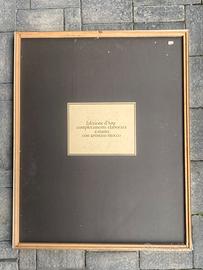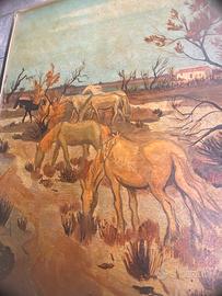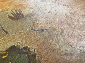 Edizione d'Arte Oleografia copia del celebre maestro francese Yves Brayer, raffigurante uno dei suoi temi più iconici: i cavalli bradi nella regione della Camargue. Si tratta di un'opera di alta qualità realizzata con la tecnica dell'oleografia, caratterizzata da un "artistico ritocco a mano" (come riportato dall'etichetta originale sul retro). Questo processo conferisce all'opera una matericità e una lucentezza simili a un dipinto a olio originale, rendendo visibili e percepibili al tatto i rilievi delle pennellate. Caratteristiche principali: • Artista: Yves Brayer (firmato in lastra in basso a sinistra). • Soggetto: Paesaggio con cavalli (Camargue). • Tecnica: Oleografia completamente elaborata a mano. • Cornice: Elegante cornice vintage in metallo dorato con profilo moderno. • Stato di conservazione: L'opera è in ottime condizioni. La cornice presenta lievi segni del tempo che ne testimoniano l'autenticità vintage, ma è pronta per essere appesa. Dimensioni dettagliate: • Ingombro totale (con cornice): 83 x 67 cm • Misura dell'opera (luce): 80 x 64 cm • Spessore cornice: 3 cm L'opera è dotata di gancio originale sul retro e dell'etichetta di garanzia dell'editore d'arte in lingua italiana. Un pezzo d'arredo di grande impatto visivo, perfetto per saloni eleganti o studi professionali. Spedizione: L'oggetto verrà imballato con estrema cura per garantirne l'integrità durante il trasporto. Disponibile anche per il ritiro a mano.