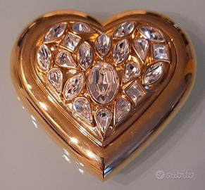 L'iconica custodia a forma di cuore placcata in oro e con un cristalli sfaccettati al centro è stata disegnata da Robert Goossens per Yves Saint Laurent.
