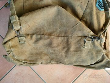 Robusto zaino in tela grezza di grande capacità. Presenta un fregio su fondo azzurro, incollato e non asportabile.