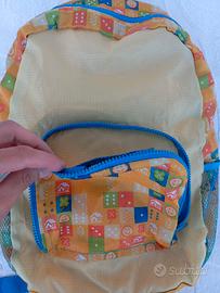 Bellissimo zaino con cerniera richiudibile Mulino Bianco "Felicità in azione" 2021.✔️Come si vede dalla foto lo zaino si richiude come una semplice borsetta, ideale da portare in viaggio oppure per qualsiasi altra occasione.✔️ Colore: Arancio/Giallo/Blu.✔️ Composizione: 100% Poliestere.✔️ Misure - Lunghezza zaino: 44 cm. Larghezza: 35 cm. Zaino in ottime condizioni da collezione.