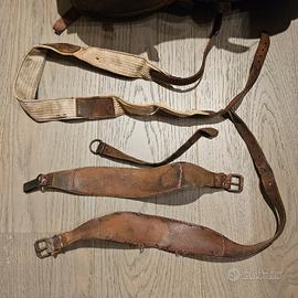 zaino originale periodo ww2 in cuoio e cotone verde, il retro in cuoio e danneggiato nella parte sottostante. gli spallacci in cuoio vengono forniti assieme a una tracolla in cotone. zaino riconducibile ad una data del 1945/50