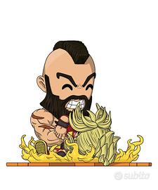"Il mio corpo di ferro è invincibile! Attento! Anche attraverso gli inverni più rigidi della Siberia, il mio calore brucia rovente!" dichiara Zangief mentre scaraventa Ken a terra per un knockout. Questo oggetto da collezione realizzato con precisione non tralascia alcun dettaglio, catturando l'intensità della mossa finale di Zangief.