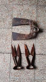 Sono una zappa doppia cioè con parte centrale aperta più una coppia di forbici che venivano usate per tagliare la lana alle pecore. Sono oggetti molto vecchi e hanno molta ruggine. Sono pezzi da collezione. Vendo tutto insieme. Vedere le foto per le condizioni generali