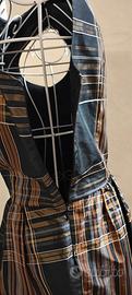 Questo capo è un abito a tubino smanicato, caratterizzato da un'elegante fantasia tartan (a quadri) nei toni del nero, marrone dorato e bianco. Il tessuto è descritto in alcune varianti come taffetà o con una consistenza simile alla gabardina, che conferisce alla gonna una struttura leggermente rigida e definita.