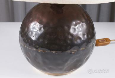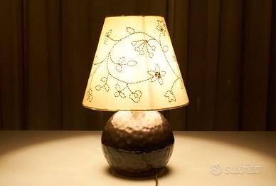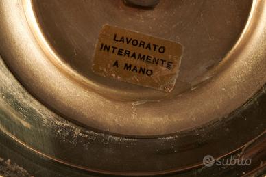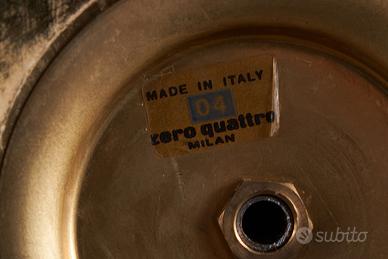 🔹 Contesto storico e produttivo La lampada appartiene alla produzione di Zero Quattro 04 Milano, una piccola realtà milanese operante negli anni ’70 attiva nella creazione di oggetti d’illuminazione di stile Mid-Century Modern / Vintage italiano. Le opere di Zero Quattro sono ricercate tra collezionisti di design italiano anni ’60-’70 e compaiono regolarmente in aste e mercati europei dedicati al lighting d’epoca. 🔹 Caratteristiche artigianali Questa lampada da tavolo presenta un corpo centrale in metallo martellato a mano, testimoniando la cura artigianale tipica dell’epoca. Il paralume bianco panna, anch’esso realizzato a mano, è impreziosito da delicati decori floreali cuciti a mano, dettaglio raro e raffinato. 📏 Dimensioni: – Altezza totale 41 cm – Diametro al centro 19 cm – Altezza paralume 23,5 cm – Diametro paralume 18,5 cm 🔹 Stile e design Il pezzo riflette le tendenze italiane di quegli anni, quando il design si intrecciava con l’artigianato e l’innovazione formale. Pur non essendo attribuito a un designer di fama specifica, è esemplare dell’estetica italiana anni ’70, apprezzata per la sua eleganza discreta e la qualità costruttiva. 🔹 Condizioni e autenticità La lampada è integra, con segni coerenti con l’età e l’uso. Il paralume e la struttura mostrano la patina naturale del vintage, senza difetti strutturali evidenti. La fattura manuale del metallo e del tessuto è un valore aggiunto rispetto alle produzioni di serie. 🔹 Perché è speciale Oggetti di illuminazione firmati o attribuiti a Zero Quattro sono apprezzati nel mercato del design vintage europeo e compaiono in aste e vendite specialistiche. Questa lampada è un pezzo di design italiano d’epoca, ideale per collezionisti, appassionati di vintage o per chi cerca un elemento decorativo con carattere e storia.
