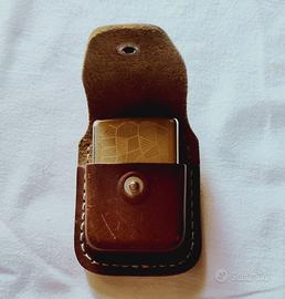 Lo Zippo risale a fine anni 80 inizio 91, lo acquistai a febbraio o marzo del 1991 in uno spaccio della base NATO di Vicenza. È usato, e ha gli inevitabili segni del tempo. La custodia di cuoio mostra un alone di umidità, mostrano in foto.