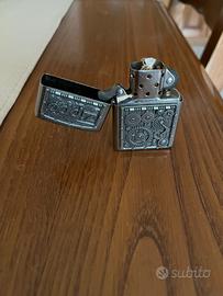 Bellissimo zippo limited edition. Pezzo da collezzione originale perfettamente funzionante con 2 boccette di benzina, 1 nuova e l’altra è stata usata solo 1 volta per vedere come si accendeva è nuovissimo e non ha difetti di nessun tipo come da foto, spedisco in tutta Italia . PREZZO DA AFFARE. Comprato a 100€ a un mercato di antiquariato l’anno scorso. PEZZO INTROVABILE.