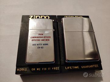Vendo due accendini ZIPPO originali Made in U.S.A., entrambi dedicati alla storica portaerei americana USS Kitty Hawk CV-63 della U.S. Navy.