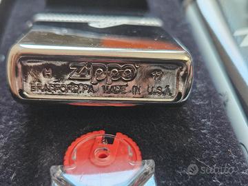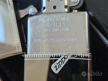 Vendo Zippo originale con decoro zip sul fronte, fondo marcato H 11. L’accendino è mai usato e viene venduto con scatola originale, pietrine e benzina Zippo come visibile in foto. Condizioni molto belle, ideale per collezionisti o per regalo. Prodotto originale Zippo Bradford PA USA. Consegna a mano oppure spedizione da concordare.