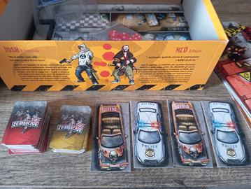 All'interno trovate tutte le miniature dettagliate dei sopravvissuti e degli zombie, le tessere di gioco, 2 mazzi di carte, i dadi e i segnalini, la mappa e ovviamente anche il regolamento.