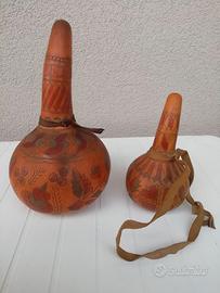 Due zucche calabash decorate ad uso borraccia, la più grande è alta cm 21 e ha un diametro di cm 11, l'altra è alta cm 13 e 8 cm di diametro. Il prezzo si intende complessivo della coppia