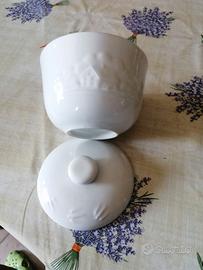 Zuccheriera del Mulino Bianco pezzo Vintage degli anni 80. Di ceramica bianca, in perfette condizioni praticamente nuova. Tenuta per bellezza nella vetrinetta come da foto. Pezzo da collezione.