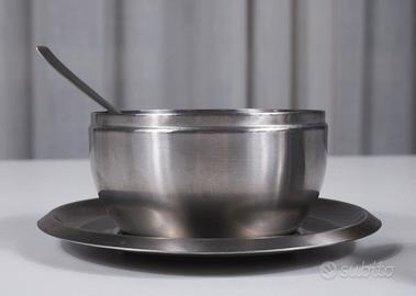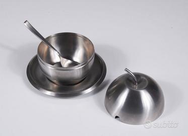 Iconico oggetto da tavola del modernariato italiano, questa zuccheriera a forma di mela è stata prodotta negli anni '70 da Morinox. L'azienda, il cui nome deriva dalla fusione di "Mori" e "inox", è stata un punto di riferimento nella produzione di posaterie e articoli da tavola in acciaio inox di alta qualità. Questo pezzo, dal design giocoso e figurativo, incarna perfettamente lo stile di un'epoca che univa funzionalità e creatività, portando in tavola elementi naturali e pop.