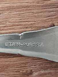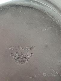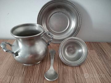 Vendo una zuccheriera in peltro. Con coperchio, piattino e cucchiaio. Tutti i pezzi sono integri. Ottime condizioni, con qualche graffio. Circonferenza massima: 27 centimetri Altezza: 13 centimetri Base: 5 centimetri. Piatto, diametro: 13 centimetri Cucchiaio, lunghezza: 10,5 centimetri.