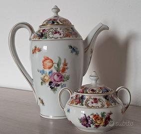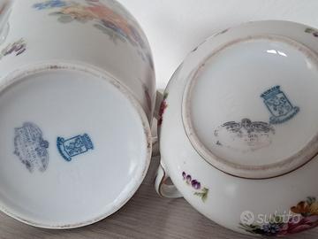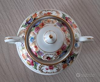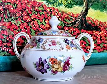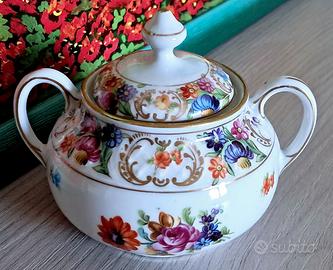 Vintage. Articolo raro. Doppio timbro. Zuccheriera in porcellana Richard Ginori Pittoria di Doccia, Manifattura Schumann Bavaria Germania. Decorazione floreale in rilievo- fiori di Dresda. Altezza 8,5 cm, larghezza 11 cm.