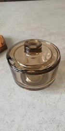 Zuccheriera /formaggiera anni 60. Nuova mai usata, ma senza confezione . La ciotola e il coperchio in vetro fumé di Fidenza sono poggiati su una struttura in ottone e legno. Molto bella e particolare da portare a tavola. PREZZO TRATTABILE.