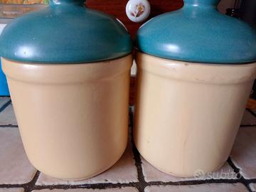 Vendo due contenitori usati in ceramica con decori frontali ,adatti per ambienti rustici o classici. Il coperchio ha un pomello ed è provvisto di gomma per aderire meglio al contenitore. Misure in foto.