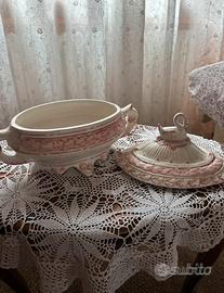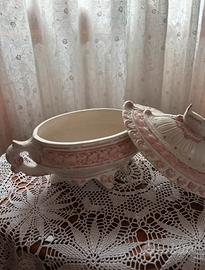 Vendo splendida zuppiera d’epoca in ceramica bianca con raffinati decori a rilievo color rosa antico. Il coperchio è impreziosito da un pomello a forma di cigno, molto elegante e particolare.