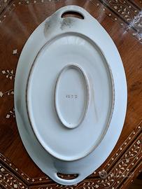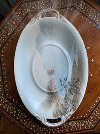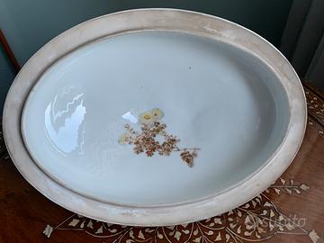 Zuppiera Giappone fine '800, finemente decorata con paesaggi, con fili dorati di finitura, composta da piatto di base e zuppiera con coperchio. Dimensioni: Piatto 44 x 28 cm Zuppiera 30 h x 34 x 20 Adatto come centrotavola o zuppiera.