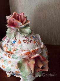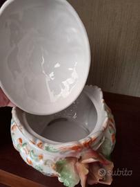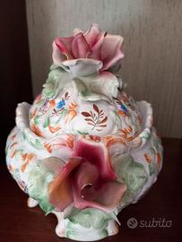 vendo bellissima zuppiera finemente lavorata e decorata con motivi floreali e fiori applicati