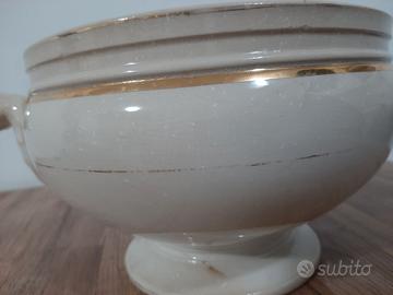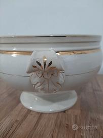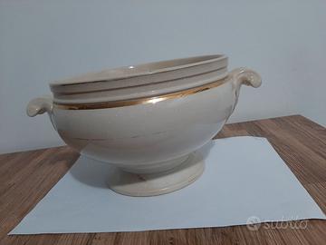 Vendo zuppiera Sci Laveno, linea Verbanum Stone. Imperfetta. Senza coperchio. Collezione privata. Venatura sulla base, piccole scheggiature, cancellazioni sulla doratura, macchie interne. Misure: diametro, 21 centimetri circonferenza, 68 centimetri altezza, 14 centimetri base, 13 centimetri