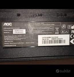 Monitor per PC AOC modello G2260VWQ6 con retroilluminazione a LED. Specifiche Chiave * Marca: AOC * Modello: G2260VWQ6 * Design: Gaming, colore nero con accento rosso sulla cornice inferiore. * Tecnologia: Supporto AMD FreeSync, ideale per ridurre lo screen tearing e lo stuttering nel gaming. Connettività * Video: Dotato di ingressi HDMI e D-SUB (VGA). Note: L'unità è completa di base da tavolo rotonda e supporta l'installazione a muro/braccio (standard VESA, fori visibili sul retro).