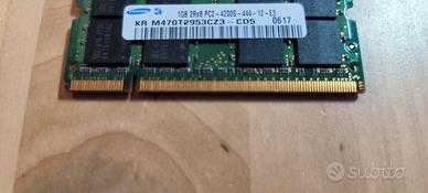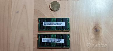 Set di due moduli RAM SO DIMM DDR2 da 1GB ciascuno. - Capacità totale: 2GB (2x1GB) - Configurazione: 2RX8 PC2-4200S-444-12-E3 - Tipo di memoria: DDR2 SDRAM (PC2-4200) - Formato: SO DIMM - Velocità: 533 MHz - Uso: per Notebook/Laptop periodo 2004/2006