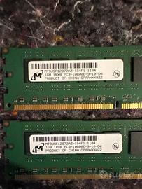 Vendo kit RAM composto da 2 banchi da 1GB ciascuno, totale 2GB. Moduli Micron DDR3 PC3-10600E 1333MHz ECC unbuffered, formato DIMM da 240 pin, ideali per sistemi desktop o server compatibili con memoria ECC. Ottimi come ricambio, upgrade o componenti di scorta per macchine datate. In vendita i 2 moduli insieme come da foto. Perfetti per chi cerca RAM DDR3 ECC, 2x1GB PC3-10600E, memoria Micron 1333MHz o banchi RAM per sistemi compatibili. Verificare compatibilità con la propria scheda madre prima dell’acquisto.