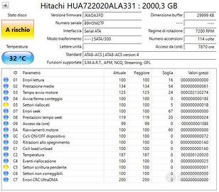 Vendo 2 hard disk Hitachi da 2TB 7200rpm (modello HUA722020ALA331). Entrambi i dischi sono funzionanti e vengono correttamente rilevati dal PC, ma presentano difetti segnalati dal sistema SMART, visibili negli screenshot allegati. Per questo motivo non sono consigliati per dati importanti o utilizzo come disco principale. Ideali per test hardware, uso secondario, NAS non critici, laboratorio o recupero dati. Nessun errore di comunicazione rilevato e temperature nella norma. Venduti come visti e piaciuti, senza garanzia. Prezzo riferito alla coppia.