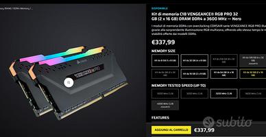 Vendo kit completo da 32GB (2x16GB) di RAM DDR4 Corsair Vengeance RGB Pro a 3600MHz. Il kit è perfetto, testato e attualmente montato su sistema top di gamma AM4. Chip Premium: Versione 3.41 (Micron Rev. B). A differenza dei kit economici, questi chip sono celebri per l'altissima stabilità su sistemi Ryzen (testate con 5800X3D) e l'ottima gestione delle latenze. Utilizzo: Ideale per workstation professionali (editing/rendering) o per chi vuole il massimo delle prestazioni in gaming senza compromessi su piattaforma AM4. Caratteristiche: Frequenza 3600MHz, profilo XMP/DOCP immediato, illuminazione RGB sincronizzabile tramite iCUE. Condizioni: Pari al nuovo, tenute maniacalmente in case ultra-ventilato. Prezzo: 180€ NON TRATTABILI. Considerando la crisi attuale dei semiconduttori e il prezzo del nuovo (338€ sul sito ufficiale Corsair), il prezzo è già scontato del 45% per un prodotto tecnicamente superiore ai kit base attuali. Scambio a mano: Verona (zona città o limitrofi). Spedizione: Disponibile a carico dell'acquirente con tuttosubito
