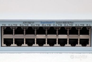 3COM SuperStack 3 Switch 4500 50-Port 10/100 Mbps (3CR17562-91 / 1756-210-000) Switch con 48 porte ethernet 10/100 Mbps, più 2 porte Gigabit dual-personality (10/100/1000 Mbps) Supporta: -switching Layer 2 -routing Layer 3 -QoS -IEEE 802.1p Leggere i documenti relativi al prodotto per maggiori informazioni.