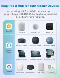 📦📦 Richiesta per Gli Utenti Apple: iOS, iPadOS 16.1 (o successivo), 2,4 GHz, un hub per la piattaforma scelta come Apple TV 4K (seconda o terza generazione) o HomePod Mini.